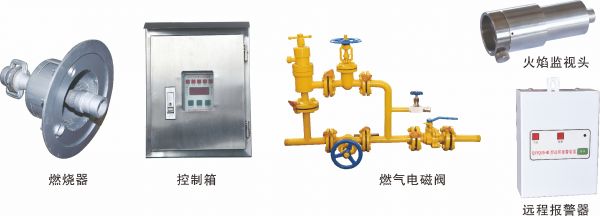 该装置主要由燃烧器、火焰监视头、控制箱、燃气电磁阀、远程报警器组成。